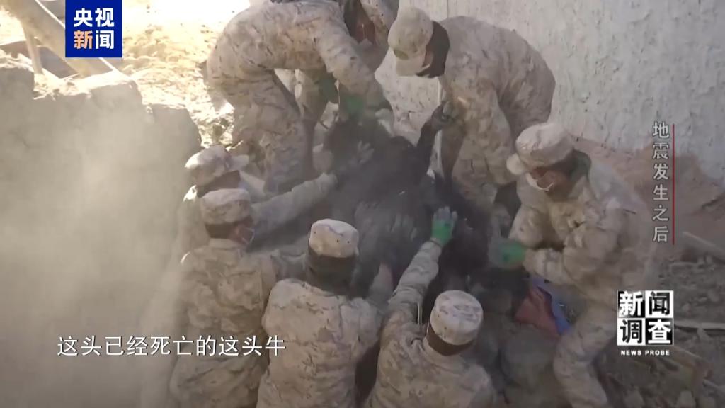 总台央视记者 张腾飞:我现在在通来村洛桑大哥家牛圈的旁边,地震对这里建筑造成的损毁情况还是非常严重的。现在武警战士正在清理的,就是牛圈里已经死亡的牛。他告诉我,这个牛圈之前一共有5头牛,当时地震来的时候有两头牛跑了出去,有3头牛被埋压在下面。在现场已经开始有腐烂的味道了,正是因为这样,我们要加紧把这些死亡的牲畜进行清理,从而来防止疫病的滋生。全村现在有100多头的这种牛羊死亡,也是有多方的力量在加紧来帮助他们清理。