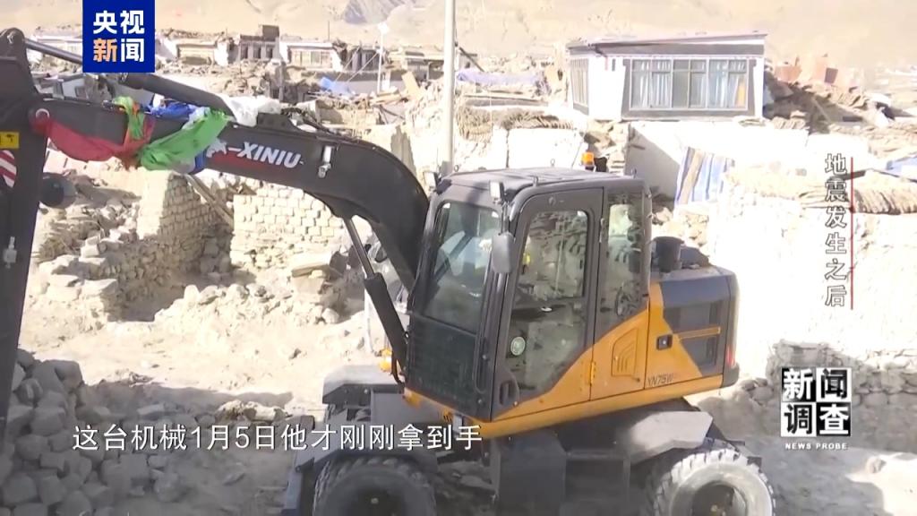 总台央视记者 张腾飞:与此同时,在现场我们还看到有大型的机械正在对村里道路进行清障。这台机械其实是达瓦次仁大哥自己的机械,这台机械1月5日他才刚刚拿到手,花了30多万,所以非常新。1月7日他听说地震消息之后,他家住在拉孜县,听说震中非常严重,二话没说就开着他家的这个非常新的机械就来到了震区。这两三天一直都在震区,哪里需要就到哪里。而且他跟我说,他的油、吃饭都是自己想办法解决。作为一个不是定日县的人,但他还是希望能够出一把力。
