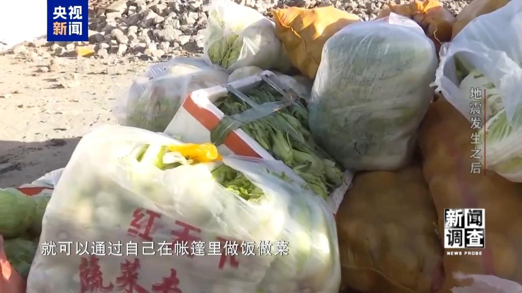 总台央视记者 张腾飞:还有一点让我们很意外的是,今天这里出现了新鲜的蔬菜,有大白菜、胡萝卜。刚才我们告诉大家,随着暖炉放进各个帐篷,既可以取暖又可以烧水做饭。还有非常新鲜的青菜,那么未来我们的老百姓就可以自己在帐篷里做饭做菜。最后再给大家看的,也是让我很意外的,在震区看到大量零食,有这样的膨化食品、瓜子,包括小朋友可能会喜欢的润喉糖。这里的物资保障的速度,超出了我此前的想象。